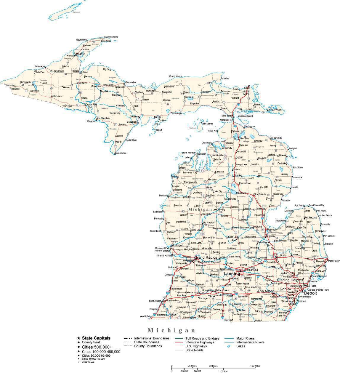 Multi Color Michigan Map with Counties, Capitals, and Major Cities