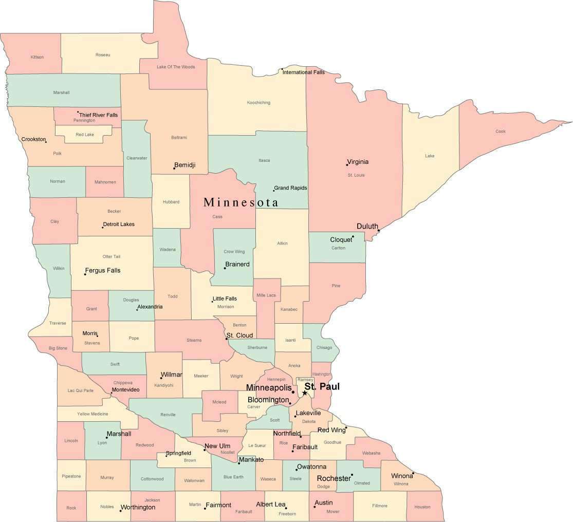 Multi Color Minnesota Map with Counties, Capitals, and Major Cities
